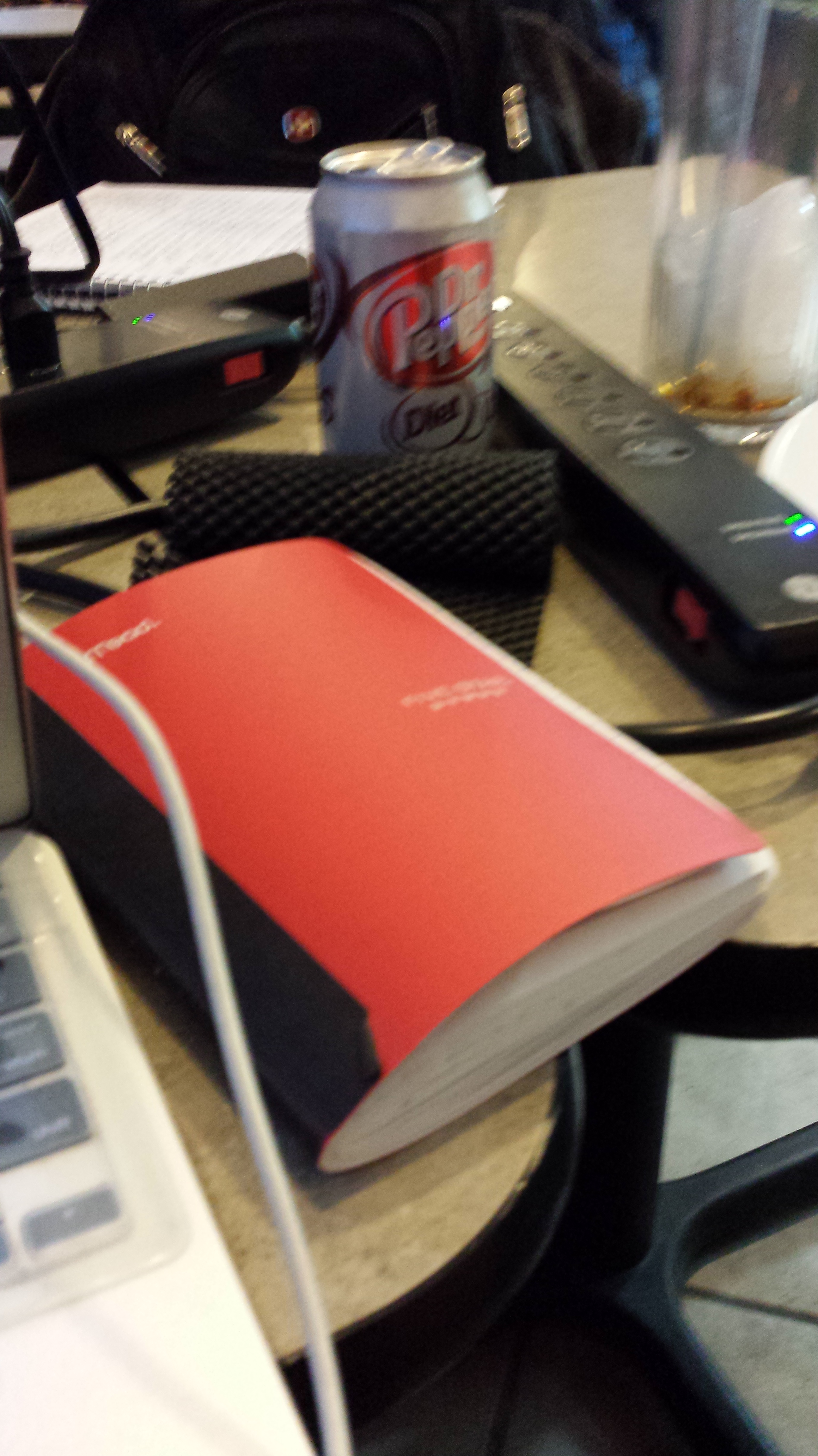 Current writing notebook with its higher-tech friends at the Tuesday write-in (Your Mom’s Basement, White Bear Lake MN)