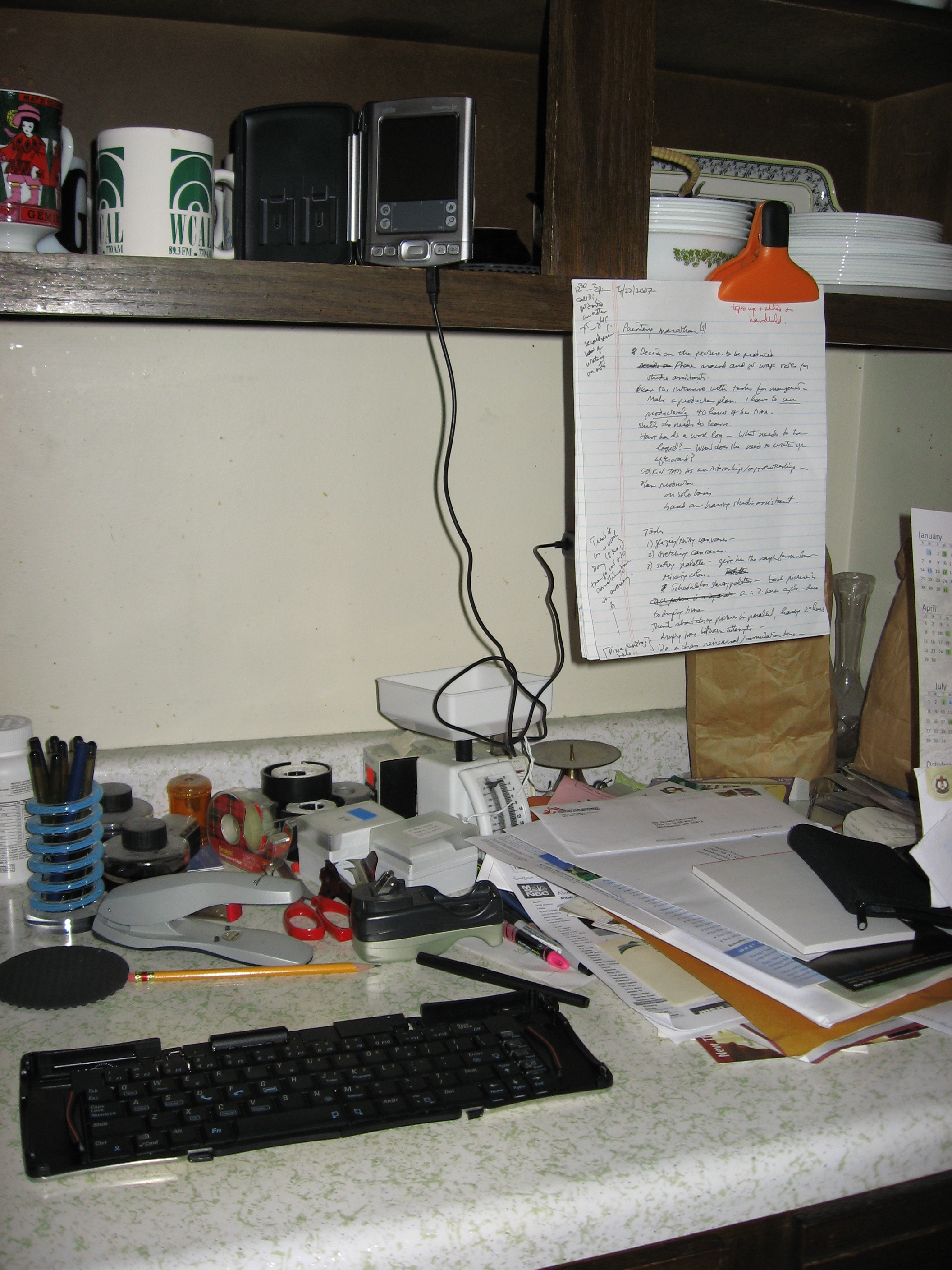 Here’s a kitchen counter-top workstation I set up in my former apartment. Note the use of the clip by way of copy stand.